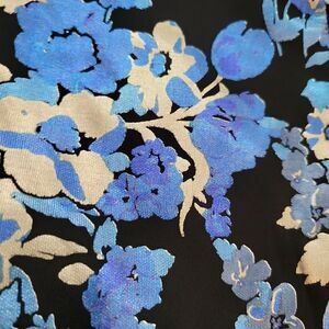 Pull-on with elastic waist and slit in the back. Black with blue and silver metalic flowers. Waist:18" from armpit to armpit. Hips:21" from side to side. Length:26" from top to bottom. 93% Polyester, 7% Spandex.