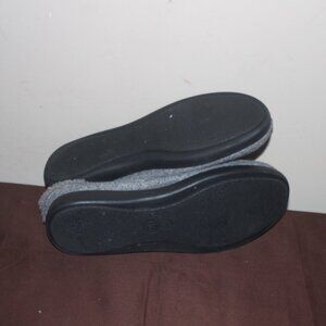 In excellent gently used condition. Grey fabric uppers and fur trim around the foot opening. lightly cushioned footbed and textured rubber soles. Size 9 wide