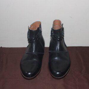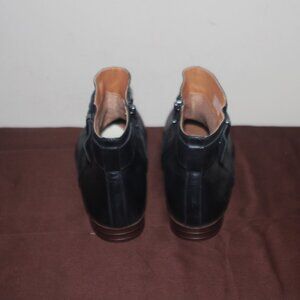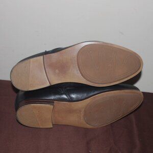 In excellent, gently worn condition. Soft black leather uppers. There is a 4 1/8 inch zipper on the inside side of exterior. 3/4" flat heels and Lightly textured rubber on the soles. Lightly cushioned insoles. Size 8 1/2