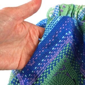 Chevron geometric print. 100% Polyester. Silky feel. Elastic waist. Waist:13" from side to side, but there is elastic. Hips:19" from side to side. Length:13" from to bottom. Inseam:3". Excellent condition! Pet-free, smoke-free home.