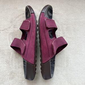The ECCO 2ND Cozmo Morillo Burgundy 2 Band Slide Flat Sandals are an on trend comfortable choice for women in US size 7-7.5 or EU size 38. Featuring a solid burgundy color and a flat heel design, these sandals are perfect for casual or travel occasions. The adjustable hook & loop wide straps add convenience and the bohemian, earthy theme makes them a versatile option for the summer, fall, or spring seasons. Made with suede upper material and a hook & loop closure, these ECCO sandals offer both quality and fashion in a comfortable slide style design.