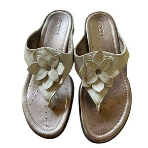Enjoy all-day comfort and timeless style with these ECCO leather thong sandals. Featuring a beautiful layered flower detail and a cushioned, perforated footbed, these slides deliver both elegance and support. The soft white leather pairs easily with casual or dressy summer outfits. Gently used with light signs of wear (see photos) but in great overall condition. Perfect for warm-weather days, vacations, or everyday wear!