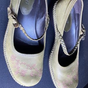 ECCO wedge Maryjane shoes. Soft Green leather with subtle tan floral embossing and braided adjustable cross strap. Gently used very good condition. Non smoking household. Thanks for Poshing