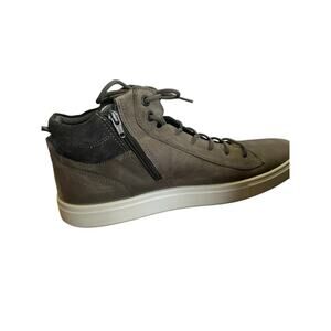 Good condition ECCO men's Kyle Hi-top Waterproof sneaker. Gray Leather. Men's size 47. Normal wear as shown in photos. Side zip.