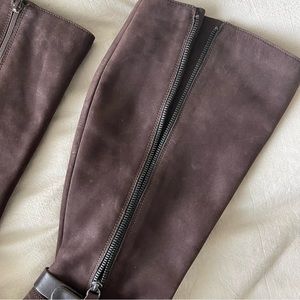 Brand new without box, only tried on inside. Coffee brown nubuck leather with equestrian smooth leather strap detail. Features fully functional zipper on outside of calf and and inside zip to allow for more room.