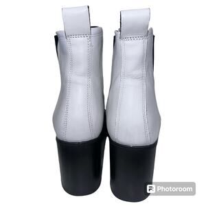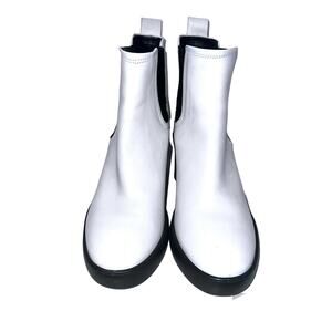 Super clean white leather Chelsea boots, trimmed out in black, including elastic stretch panels on each side of the ankles. Pull up strap on the back.