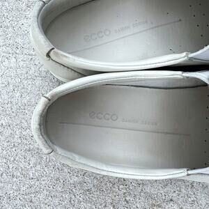 ECCO soft 7 woven slip on sneakers. They are a stone/beige leather upper with basketweave design. A few scuffs from normal wear and tear. Size 9.