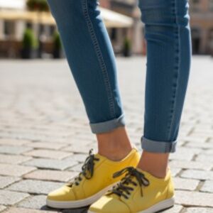 Nordic styling meets urban chic in this cheerful yellow leather sneaker in mint, like new condition. Size 7 US; 38 EU. Changed out original laces to brown to enhance outdoor look. Will provide extra white laces to buyer. High quality craftsmanship.