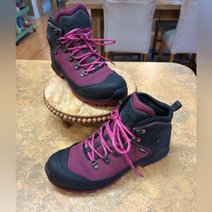 Explore the outdoors with ECCO Women's Hiking Boots. Featuring a stylish black and pink design, these boots offer both comfort and durability for your adventures. Gore-Tex. Waterproof. My sister bought these for a trip and not used after. Minor wear. Size 40(9/9.5)