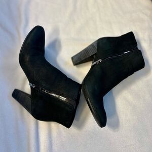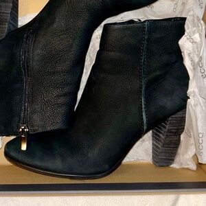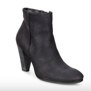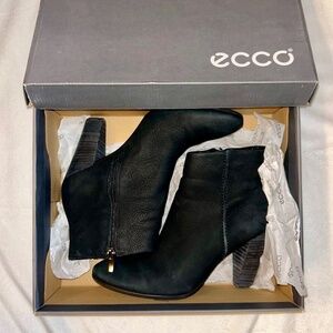 ECCO Shape 75 Ankle Boots. EUR size 39 fits US 8.0-8.5. In original box. Great condition with exception of the right sole - see photos. I didn't realize until now that a small piece broke from the sole -- it could be fixed. I would keep these for myself but I stopped wearing them 6 years ago due to heel height. 100% Leather uppers, synthetic sole. Shaft measures approximately 6.5" from arch. Heel measures approximately 3.5". Non smoking no pet home. Purchased new.