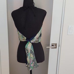 Drapey, Paisley print all silk scarf top from Echo. Leather Cord to tie at neck. Reverses to a solid midnight blue. Never worn, NEW condition, no tags, pristine condition. One Size fits all. If you have a small waist and are wider at the hips, you will be a total sexpot in this!!!