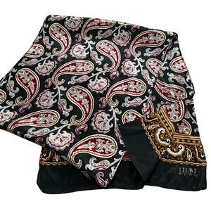 ECHO for Club 7 silk scarf - long rectangle done in black with white, gold and red paisley print design. This piece is vintage 1990’s - logo in one corner - classic look - gently worn - no flaws.