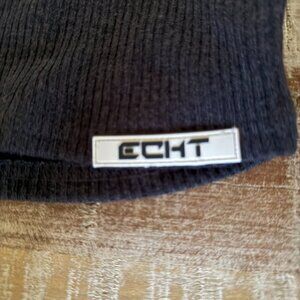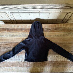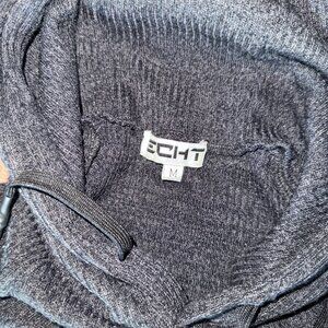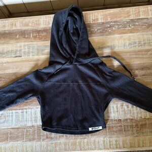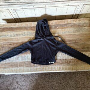 Very gently used ECHT Cropped Black Marled Long Sleeved Top with Hoodie Medium. Super cute and looks brand new. No stains. Smoke-free home. The last few photos had the flash on...sorry. The color is darker as shown in the first few photos, not a medium gray.