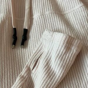 Light pink ribbed pullover by ECHT. Features a cozy hood and drawstrings.