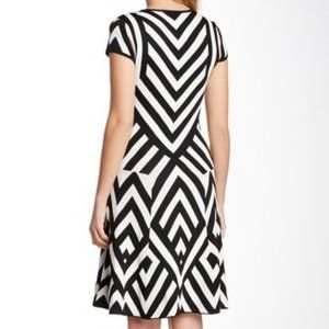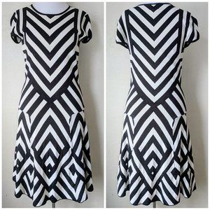 ECI Mitered Striped Knit Dress in black & white geometric. Chevron / diamond print / pattern is knitted in to this 63% rayon 37% nylon dress. Material is like a thick cardigan or light sweater, along with the fit & flare silhouette is very flattering. Scoop neck. Short sleeve capsleeves. Flared skirt hits right above the knee. Beautiful for spring!