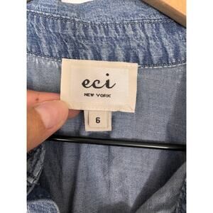 Lightweight ECI button-down denim dress in a size 6. Features long sleeves, collared neckline, front chest pockets, and a flattering waist seam for added shape. Made of 100% cotton in a medium-wash finish.