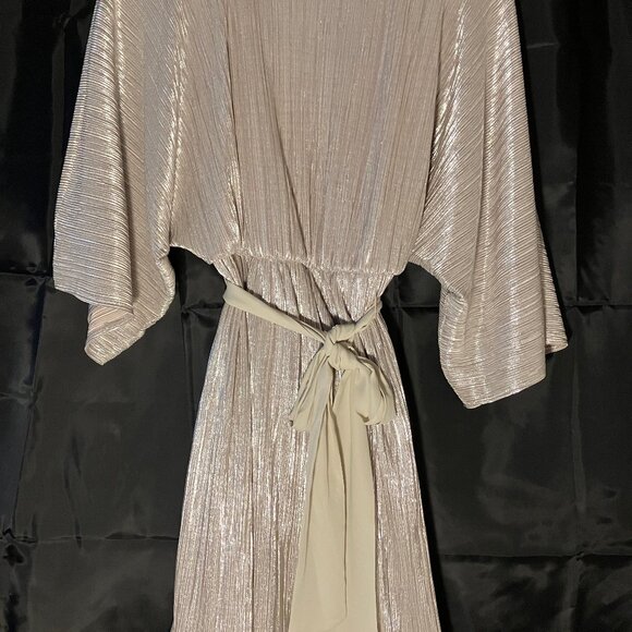 Pullover dress of shimmery micro pleated polyester with beige polyester slip attached and beige polyester sash. Waist is elasticized for comfy fit, and kimono sleeves , 36" length. Worn once -very comfortable and easy to wear. Excellent condition.