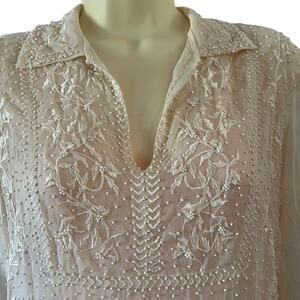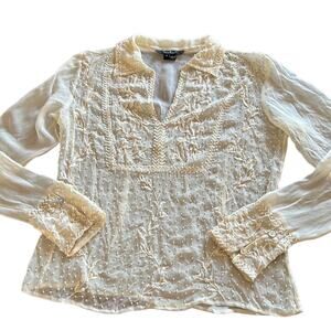 ECI Cream Silk Beaded Blouse Sheer Fancy Woman Size Small Boho Fairy
