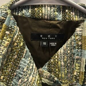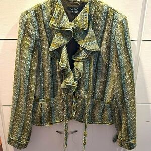 Beautiful greens in the tones of olive, light green and teal. Stunning ruffle detail trim. Tie closure. Pockets. Size 10.