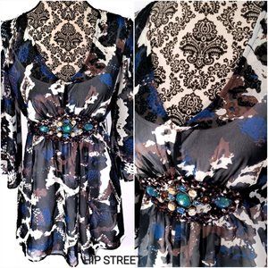 A beautiful chiffon tunic. Large jewels on the waist that has streamer ties to tie in back. Under slip not included. bust 38 | waist 32 | length 29 | No content tag, but feels like poly