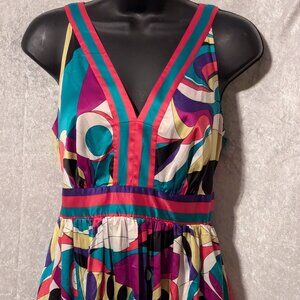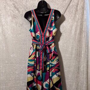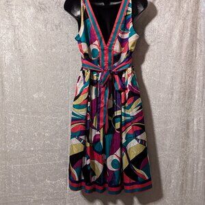 ECI NEW YORK Silk Colorful V Neck Dress Waist Tie Ruching Waist Size 10