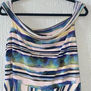 ECI New York Asymmetrical Abstract Print Cowl Neck Sheer Overlay Midi Dress