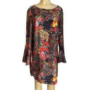 ECI New York Multicolor Floral Bell Sleeve Dress Sz 10 Boho Fall Style Festival