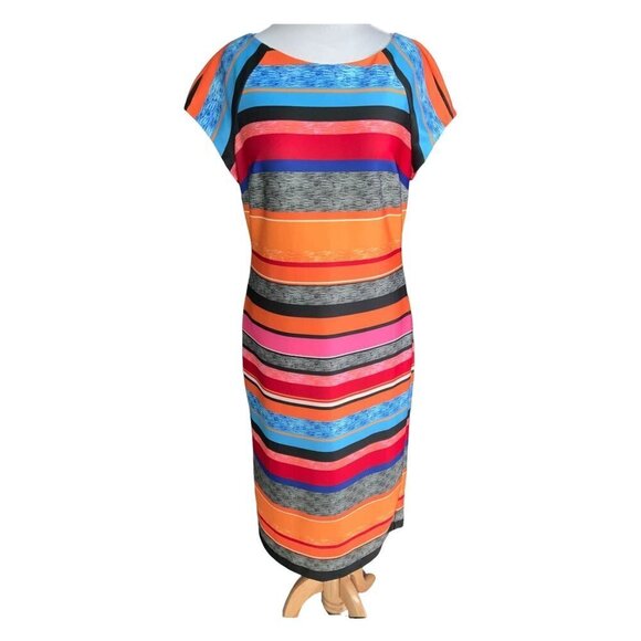 This brand new, tagged ECI New York dress in size 12 is a stunning addition to any woman's wardrobe. It features a vibrant, multi-colored striped pattern, cap sleeves, lined and back zip design in a longer maxi length.