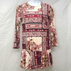 ECI Patchwork Floral Boho Midi Dress Small Cream Pink Burgundy Long Bell Sleeve