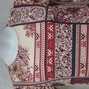 ECI women’s size small patchwork floral midi dress, new with tags. Features a cream, pink, and burgundy print with hints of black in a unique patchwork design. Long bell sleeves with small cutout and button detail at back neckline. Ruffled hemline adds a playful, feminine touch. Stretchy fabric for comfort and ease. Measures 18" armpit to armpit and 35" length.