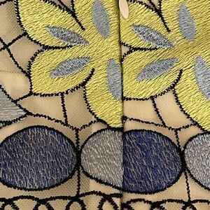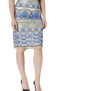 This knee-length pencil skirt by ECI features a stunning blue embellished design that adds a touch of elegance. Perfect for a cocktail or night out, it combines a sleek silhouette with intricate detailing for a sophisticated look. Fully lined. Measures 25 1/2 inches in length and 18 inches lying flat side to side. Good condition!