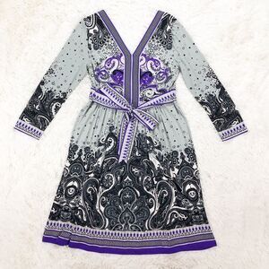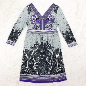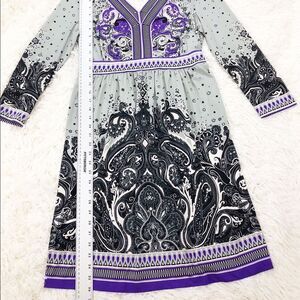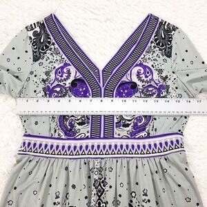 ECI Grey Purple Printed 3/4 Sleeves Empire Waist Stretchy Dress Size Small