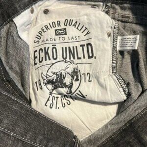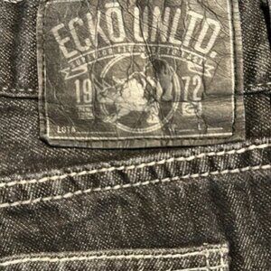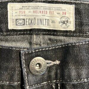 These are a pair of ECKO UNLTD 759 Relaxed Fit black denim jean shorts, from the Y2K. The shorts are made of black denim and feature a relaxed fit, characteristic of the early 2000s skater and hip hop fashion trends. They have a classic five-pocket design and a standard zip fly and button closure.