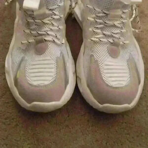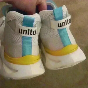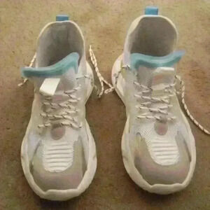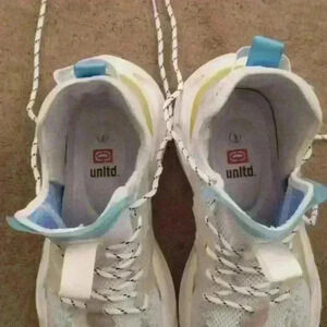 ECKO UNLTD "CARTER" O1M SIZE 9 MEN'S SHOES. VERY LIGHTLY WORN AND CLEAN. LIGHT WEAR ON TREAD AS SHOWN. NO ORIGINAL BOX. ORIGINAL INSOLES AND LACES. TURQUOISE, YELLOW, GREY AND WHITE. NON SMOKING NON PET HOME.