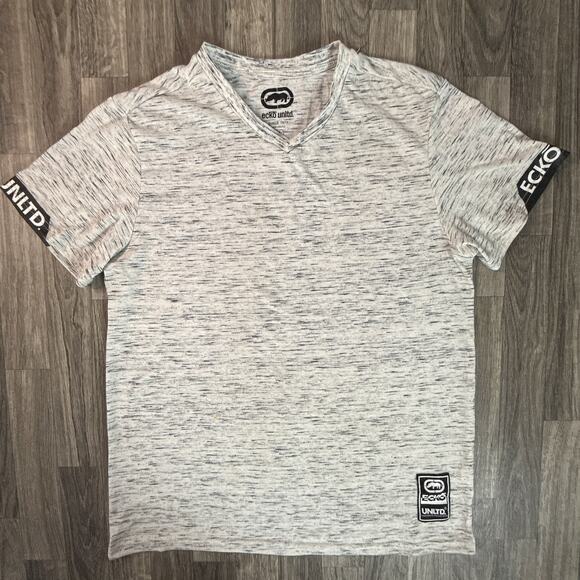 ECKO UNLTD Heather Gray Short Sleeve V-Neck Graphic Tee Streetwear Rhino Logo