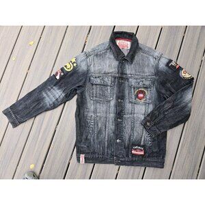 ECKO UNLTD Jacket Mens LARGE Black Patches Denim Distressed Button