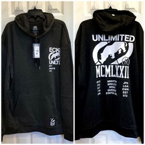 ECKO UNLTD makes this Small Tilt Fleece-Lined Pullover Hoodie in Men's Size 3X. The color is Charcoal Heather, which is a very dark gray - almost black. MSRP $46.50. Rock the Rhino brand in the Small Tilt ECKO UNLTD fleece pullover hoodie. Be anything but basic in this hoodie and make it your new go to. It has a kangaroo pocket, ribbed cuff and hem and a drawstring hood. The ECKO logo is on the left chest in large letters and an ECKO logo patch is on the left bottom. This is a regular fit. It's 100% polyester fleece, so machine wash (cold) and tumble dry. The pit-to-pit measurement is 28", the length is 32" and the sleeves are 28" (including the 2" ribbed cuff). Really nice and cozy and NWT!