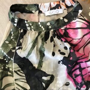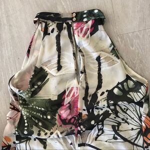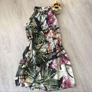 This Bright & airy choker neck dress is fully lined with dainty gold tone double buttons at the back of the keyhole neck . The print is tropical themed with colorful butterflies .