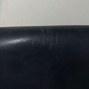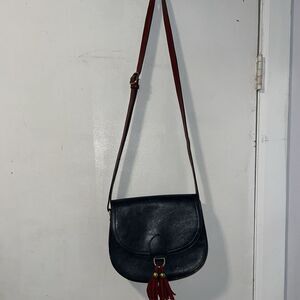 Navy blue faux leather with deep red paneling, strap and tassels. Back panel is a slip pocket. Flap closure, fully lined with interior slip pocket and zip pocket. Small blemish on the top of the flap (see picture) but overall excellent condition. Measures 9.5”H x 8”W x 3”D with an adjustable 12”-27” strap drop.