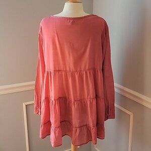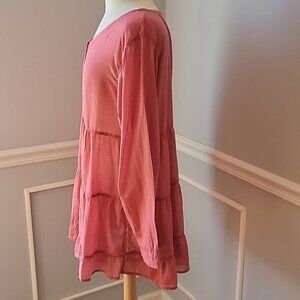 ECOTE Pink Coral Scoop Neck Half Button Down Tiered Ruffle Boho Tunic Dress Top