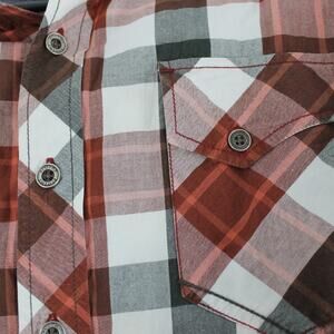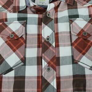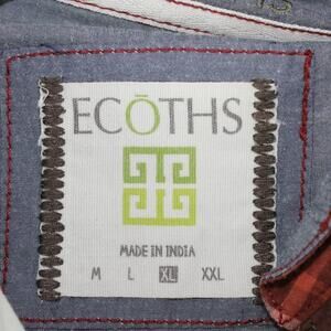 Elevate your wardrobe with this ECOTHS button-up shirt, crafted from 100% organic cotton. The classic plaid pattern features a blend of cream, rust-toned color, and black, offering a versatile look for any occasion.