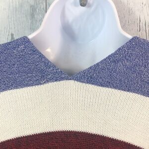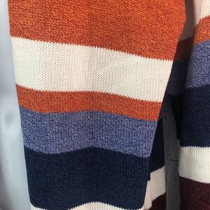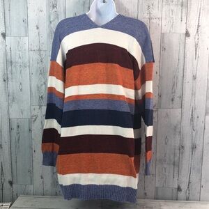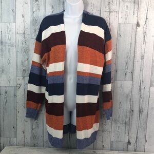 Shades of blues, white, rust, burgundy stripes, open front, v-neck in back, pockets, long, soft,colors may vary due to lighting,NWT Sz: L