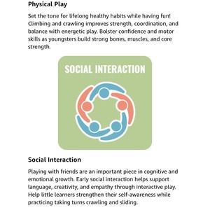 Engaging in active tasks to strengthen the large muscle groups in the arms, legs, and core are important in your baby’s growth. With this foam climber, little ones will build balance and coordination while they climb, crawl and slide and develop confidence and body awareness. Foam Climber: Babies and toddlers can safely climb and crawl on and around this beginner structure; the small set is a great way to introduce soft play in early childhood environments