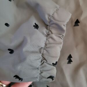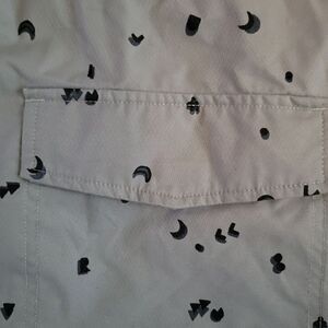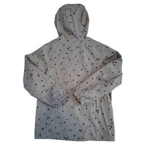 Two big four pockets in the front. Elastic on the hood and sleeves. Shell:100% Nylon. Lining:100% Polyester. Chest:18.5" from armpit to armpit. Length:15" from the armpit down. Sleeve length:16" from the armpit down. Excellent condition!