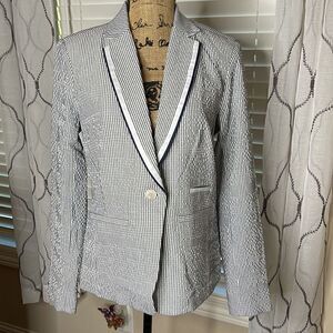 Brand new without tags. Never have been worn. Size small navy blue and white Striped seersucker style long sleeve jacket. Lined. This Brand you will see at Neiman Marcus and or Saks fifth Avenue