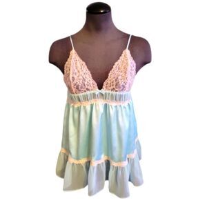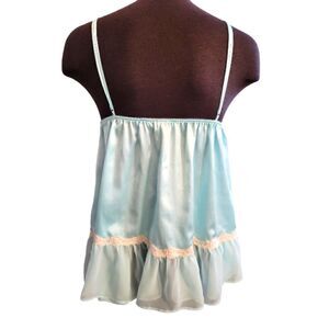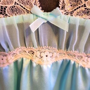 Tiffany blue with pink lace. Adjustable straps. Elastic all the way around. 100% Polyester. Silky feel. Length: 15" from the bow on the chest down. Excellent condition! Smoke-free, Pet-free home.