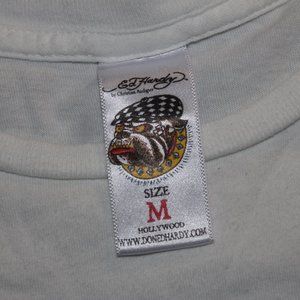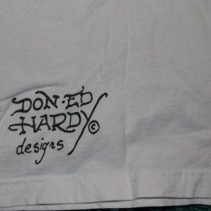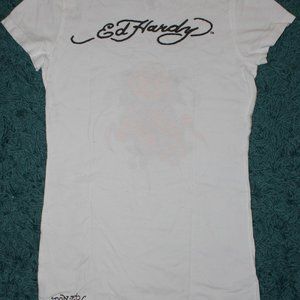 This size M Ed Hardy shirt has a rhinestone covered emblem on the front and a clean solitary Ed Hardy print on the back. Long shape makes it perfect for tucking in or wearing with jeans. The white is still vibrant white and all the rhinestones are still in place
