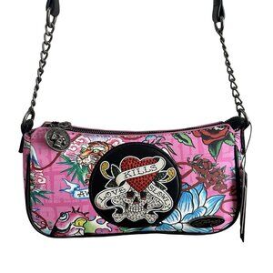 ED HARDY Pink Hand & Shoulder bag Love Kills Slowly Pink & Black Skull Bling