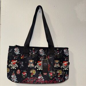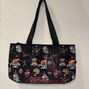 Ed Hardy tote with bold tattoo graphics. Black with vibrant designs.