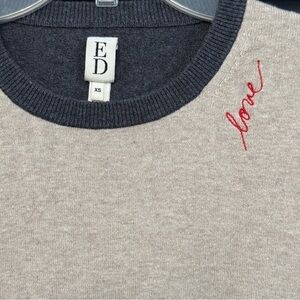 Fall in love with this playful pullover from ED Ellen DeGeneres. Featuring a colorblock design with bold red and ivory sleeves, soft cotton-cashmere knit, and a charming embroidered “love” detail at the collar—this sweater adds effortless style to any outfit. Pit to pit: 18” | Length: 23” | Sleeve: 23.5”